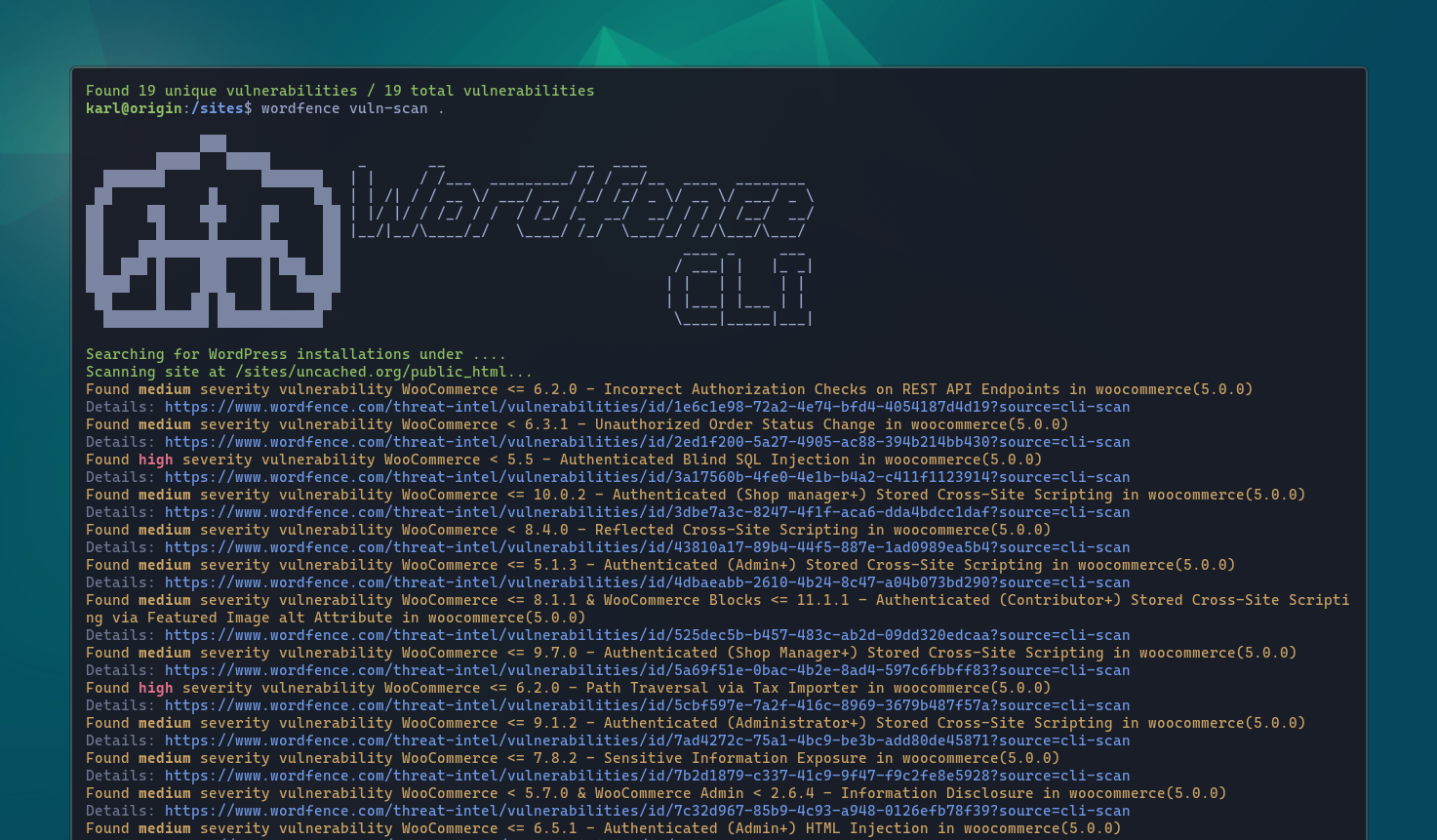 Let's run a vulnerability scan across all our sites. Wordfence CLI can